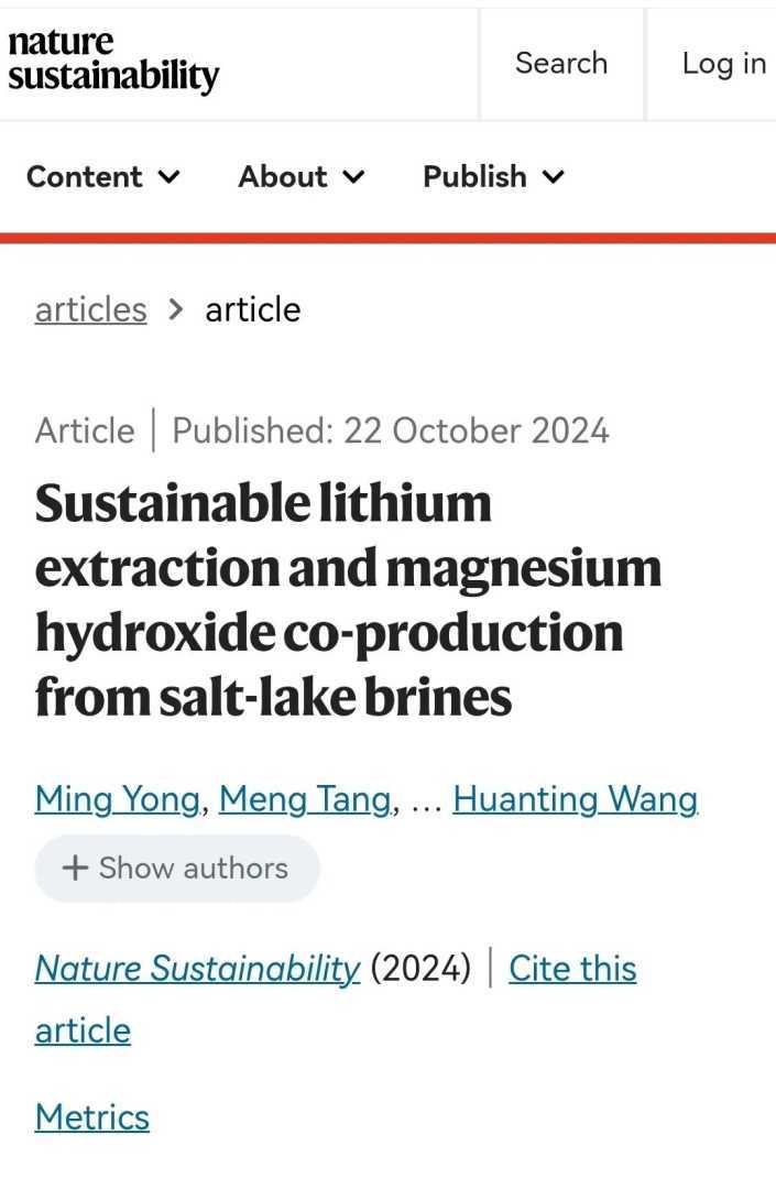 Nature Sustainability期刊截图,展示盐湖提锂技术的突破性成果。
