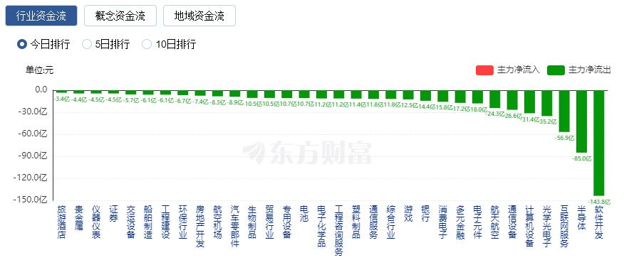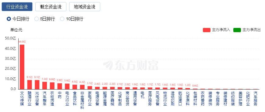 资金流向上,文化传媒、酿酒行业、光伏设备等净流入靠前,其中文化传媒净流入43.96亿元。净流出方面,软件开发、半导体、互联网服务等净流出排名靠前。