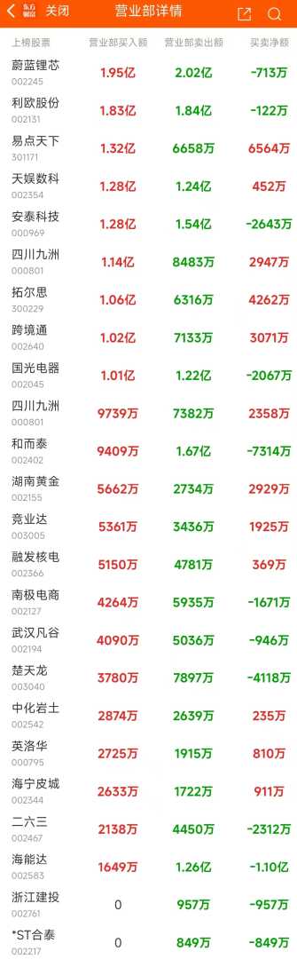 从机构席位来看,日内机构席位净买入13只股票,其中对四川九洲的净买入金额达到8561万元,对星环科技的净买入金额则为4779万元。然而,也有机构席位呈现净卖出,如对易点天下的净卖出金额就高达2.52亿元。