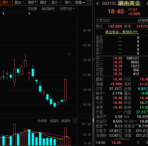 在昨日尾盘快速拉升涨停后,今日湖南黄金再度一字涨停,斩获两连板。最新股价报18.4元/股,封单量达到50.51万手。