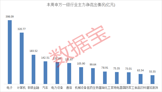 本周(11月18日~22日),A股主力资金净流出合计2173.81亿元,其中今日净流出额最高,达到928.89亿元。申万一级行业均遭遇主力资金撤离,其中电子、计算机板块净流出额分别位居前两位,达到398.09亿元和320.77亿元;非银金融、汽车、电力设备、通信、机械设备等板块净流出额也超过100亿元。相比之下,银行和煤炭板块净流出额较小,分别为2.62亿元和1741.24万元。