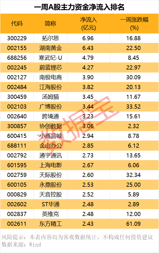 同时,大消费板块中的龙头个股如赛力斯、长安汽车、五粮液等也遭到主力资金的抛售,净流出额分别为24.03亿元、17.17亿元和15.19亿元。而在净流入方面,本周共有94只股票的主力资金净流入超过1亿元。其中,拓尔思、湖南黄金、寒武纪-U、蔚蓝锂芯排名前四,主力资金净流入额分别为6.96亿元、6.43亿元、4.79亿元和4.27亿元。