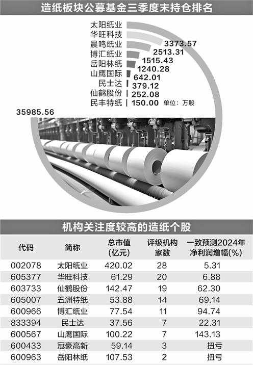 从机构关注度看,太阳纸业、华旺科技、仙鹤股份、五洲特纸、博汇纸业等纸企受到多家机构关注。根据机构一致预测,冠豪高新、岳阳林纸有望实现扭亏为盈,山鹰国际有望实现翻倍式增长,博汇纸业预测增幅超过90%,五洲特纸、仙鹤股份预测增幅均超过60%。此外,多只造纸个股均为公募基金重仓股,太阳纸业的基金持股量最高,达到近3.6亿股。