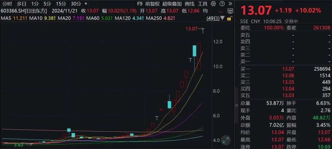 强势股方面,华为超充概念股日出东方再次涨停,走出14天12板的强势行情,大千生态走出13连板,粤桂股份则9连板。尽管日出东方已公告提示该业务并未形成业务收入和收益,但股价依然受到市场追捧。