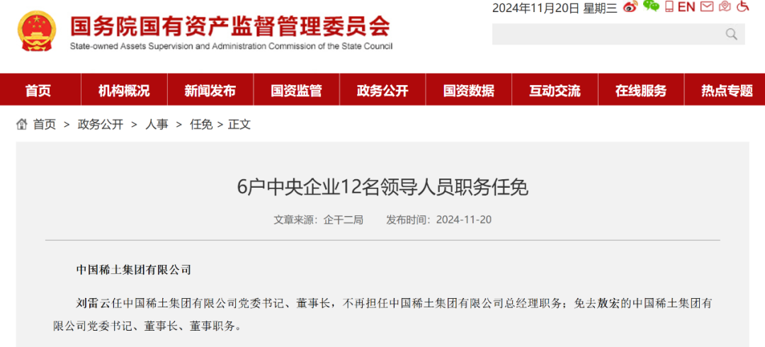 据国资委11月20日公告,刘雷云新任中国稀土集团有限公司党委书记及董事长。敖宏因年龄原因卸任,他曾是中国铝业公司高层,自中国稀土集团成立以来便担任董事长。