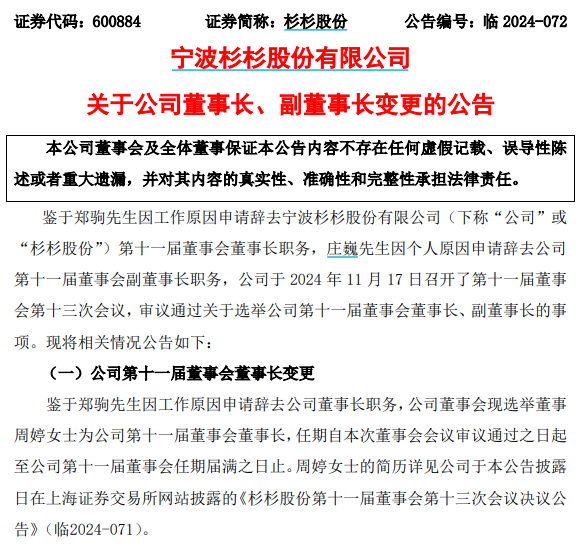 杉杉股份表示,郑驹因工作原因辞去董事长职务,而周婷被选举为第十一届董事会董事长。同时,郑驹将接替庄巍担任公司副董事长,庄巍则继续担任公司董事。