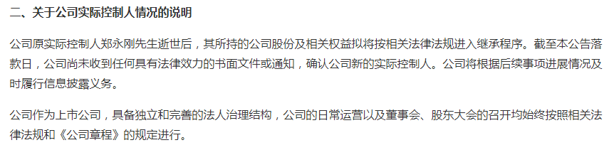 杉杉股份宣布郑驹辞去董事长职务,由郑永刚遗孀周婷接任,双方完成工作交接。杉杉股份经营情况受创始人离世及股权争夺影响,但仍面临资金链紧张等挑战。