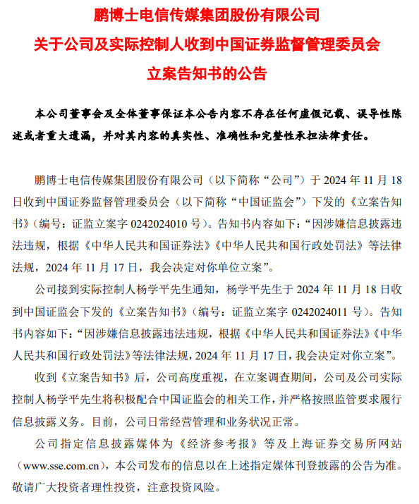 *ST鹏博于2024年11月18日正式发布公告,披露公司及其实际控制人杨学平均于当日收到中国证监会下发的《立案告知书》。此次立案的原因是公司及杨学平涉嫌信息披露违法违规,证监会依法依规于2024年11月17日作出了立案决定。