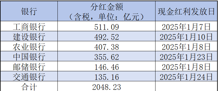 六家国有银行自1月7日起逐步开展2024年中期分红工作,合计拟分红2048.23亿元,每家分红金额均超百亿元,分红比例均在30%左右。