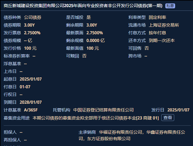 商丘新城建设投资集团于2025年1月7日成功发行4.4亿非公开发行公司债券,期限3年,利率2.75%,资金用于偿还公司债券本金,主承销商包括华福证券、华鑫证券及东方证券。