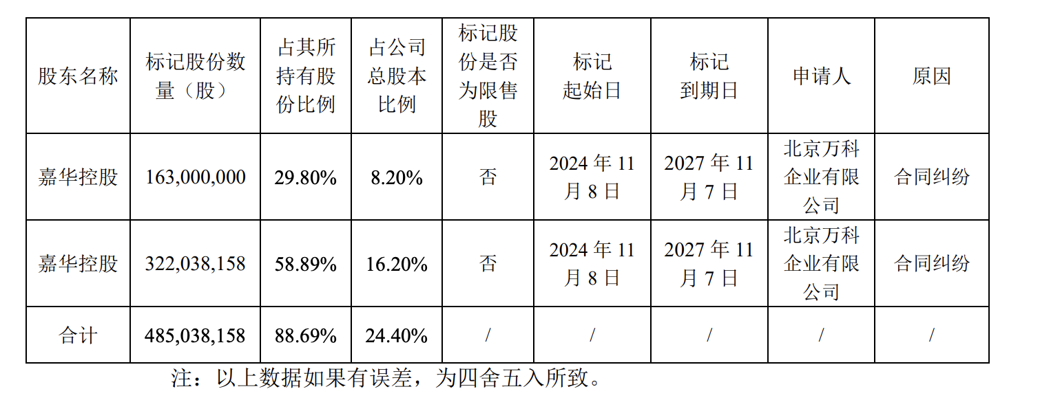 北京万通新发展集团股份有限公司披露,其控股股东嘉华控股因合同纠纷,所持4.85亿股已质押股份被司法标记,其中1.63亿股和3.22亿股分别被冻结,占总股本的32.49%。