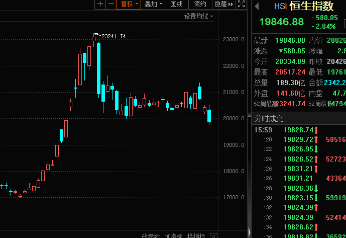 人民币汇率的调整对港股市场的影响更为显著,恒生指数跌破20000点大关,收盘跌幅达到2.84%,恒生科技指数更是收盘大跌4.19%。