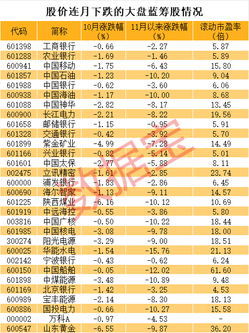 据统计,千亿市值公司中有多达30只个股在10月、11月以来股价均出现下跌。其中,工商银行、农业银行、中国移动、中国石油、中国银行等5只万亿市值个股均连续两月下跌。两大水电龙头长江电力和华能水电更是跌破9月18日收盘价,最新收盘均创出阶段新低。