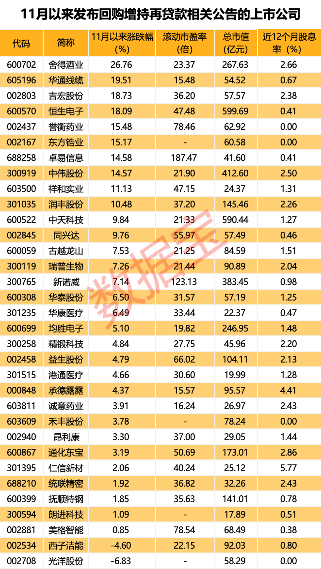 从行情表现来看,发布相关公告的个股股价普遍表现较好。11月以来,相关个股平均上涨7.68%,跑赢大盘。其中,舍得酒业、华通线缆、吉宏股份等10股累计涨幅在10%以上。此外,回购再增持贷款所选标的还包括多只高股息个股,如仁信新材股息率高达5.77%,承德露露、通化东宝、舍得酒业等股息率也均在2%以上。