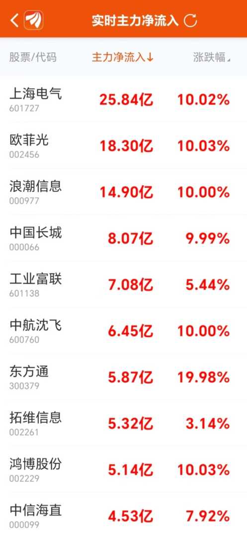 东方财富Choice数据显示,11月8日主力净买入前十大个股中,上海电气以25.84亿元的净买入额位居榜首,且该股当日涨停。紧随其后的是欧菲光,主力净买入额达到18.30亿元,同样收获涨停。
