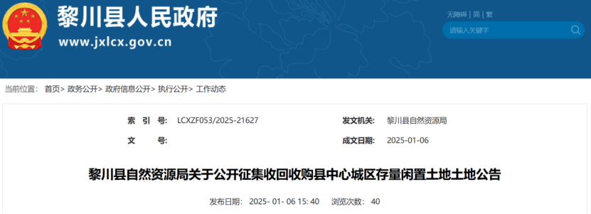 1月6日,江西黎川县发布了一则土地收储公告,明确将收回收购县中心城区闲置存量土地,涉及无力或无意愿继续开发的企业用地、已供应未动工的住宅和商服用地,以及进入司法或破产拍卖程序的其他用途土地。公告指出,由土地储备机构委托专业土地估价机构,对拟收回收购地块进行市场价格评估,并根据评估结果,结合企业土地成本,确定收地基础价格。