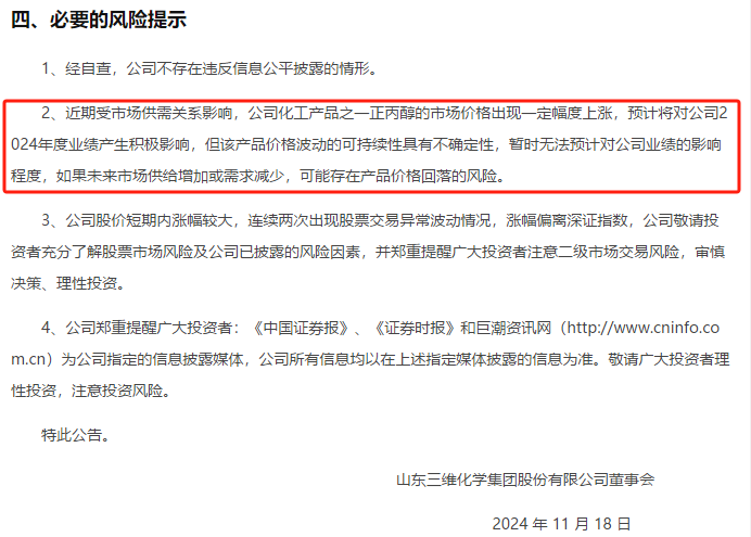 此外,化工产品的价格上涨也被视为推动化工板块上涨的另一重要因素。例如,近期涨幅显著的三维化学在11月18日晚间的股票交易异常波动公告中提到,受市场供需关系的影响,公司化工产品之一的正丙醇市场价格出现了一定幅度的上涨,预计将对2024年度的公司业绩产生积极影响。然而,该产品价格波动的可持续性存在不确定性,暂时无法准确预估对公司业绩的影响程度。如果未来市场供给增加或需求减少,可能存在产品价格回落的风险。