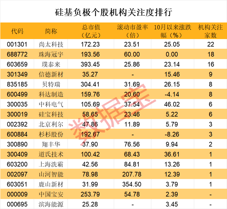 从市场表现来看,10月以来,中科电气、道氏技术、贝特瑞、尚太科技等负极材料相关企业股价涨幅显著。同时,尚太科技、珠海冠宇、璞泰来等企业的机构关注度较高,多只个股接受了机构调研,透露了硅基负极的布局进展。
