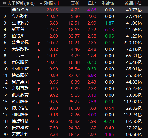 今日开盘后,三六零股价在短短1分钟内迅速拉升直至涨停,市值接近885亿元。同时,福石控股、立方数科均以20%的涨幅涨停,豆神教育、值得买等个股也大幅上涨。此外,天娱数科、二六三、南兴股份、中科金财、博杰股份、省广集团等个股也纷纷涨停,整个人工智能板块共有10只个股涨停。