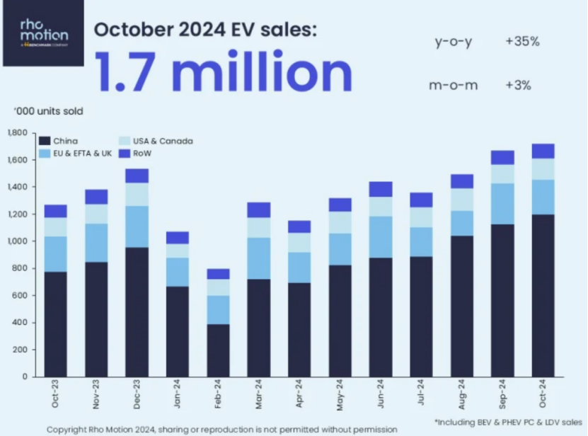 中国电动汽车市场表现强劲,再次引领全球电动汽车市场销量增长。当地时间11月13日,市场研究公司Rho Motion发布的最新报告显示,全球10月份电动汽车(包括纯电动和插电式混动汽车)销量同比增长35%,达到172万辆。其中,中国地区销量尤为突出,同比飙升54%,达到120万辆,创下历史新高,并带动了全球其他地区的销量增长。