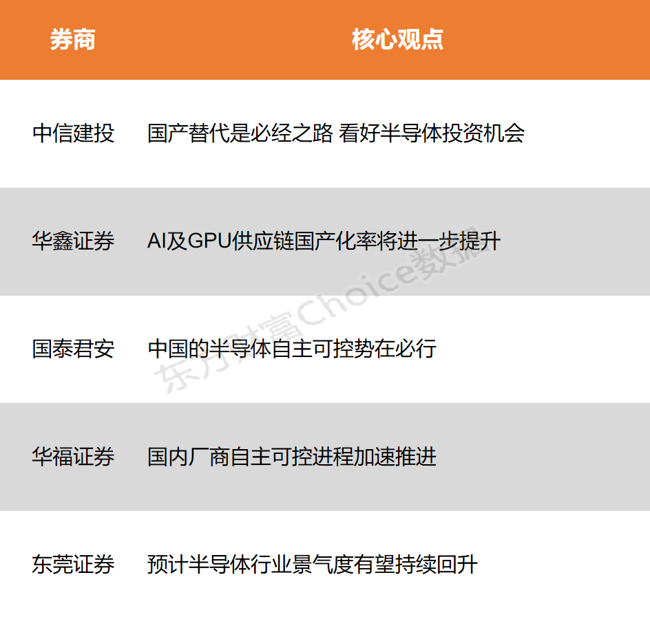 此外,华福证券认为,随着海外对华半导体先进制程核心芯片、设备、零部件、材料的限制日益加深,半导体产业链关键环节国产化落地已进入攻坚期和深水区,国内厂商自主可控进程加速推进。东莞证券则预计,在人工智能和国产化替代的双重驱动下,半导体行业景气度有望持续回升。