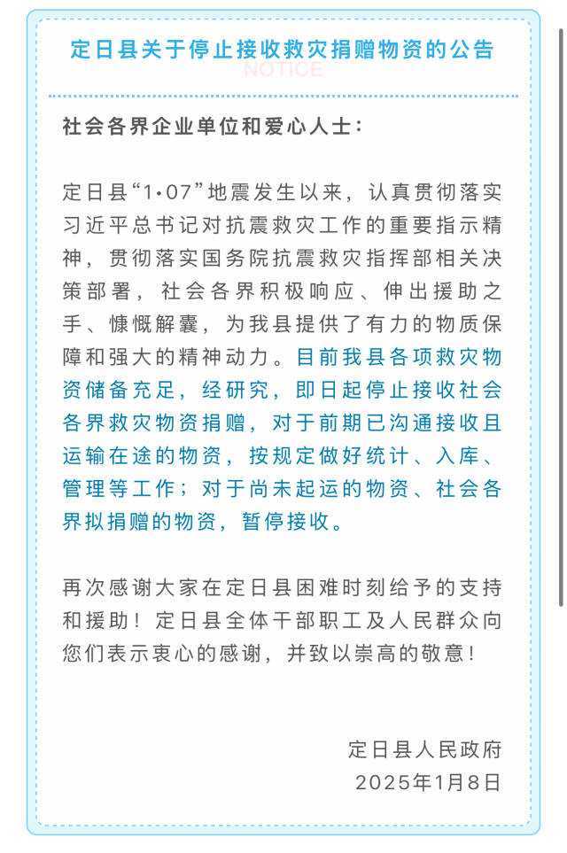 1月8日下午,定日县融媒体中心官方公众号“珠峰之窗”发布公告,宣布停止接收救灾捐赠物资。公告指出,自“1·07”地震发生以来,社会各界积极响应,慷慨解囊,为定日县提供了充足的物资保障和强大的精神支持。目前,各项救灾物资储备已足够,因此决定即日起停止接收新的救灾物资捐赠。对于前期已沟通接收且正在运输途中的物资,将按照相关规定进行统计、入库和管理;而对于尚未起运或拟捐赠的物资,则暂停接收。