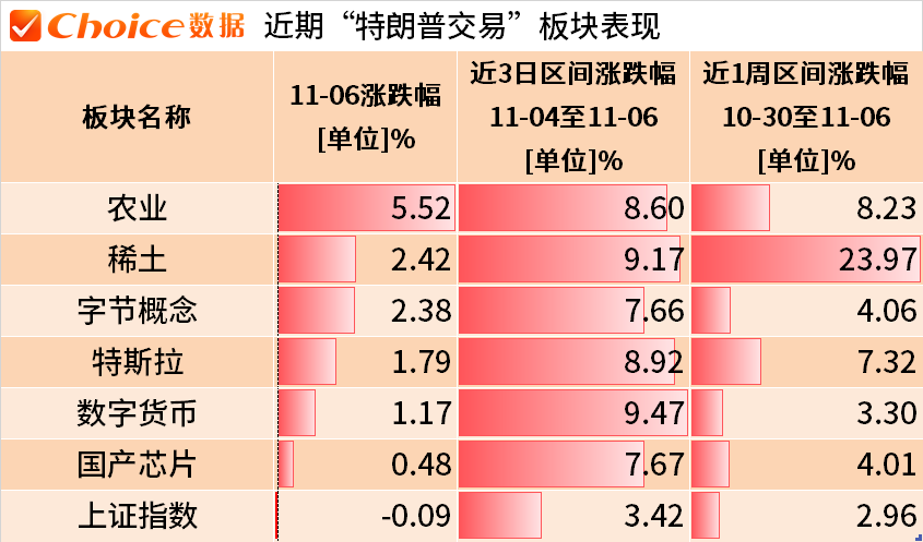 美国大选结果出炉,A股市场反应迅速,特定股票及农业、稀土等板块表现抢眼,背后或存在“特朗普交易”逻辑。本文详细分析了这一现象,并提供了相关数据支持。
