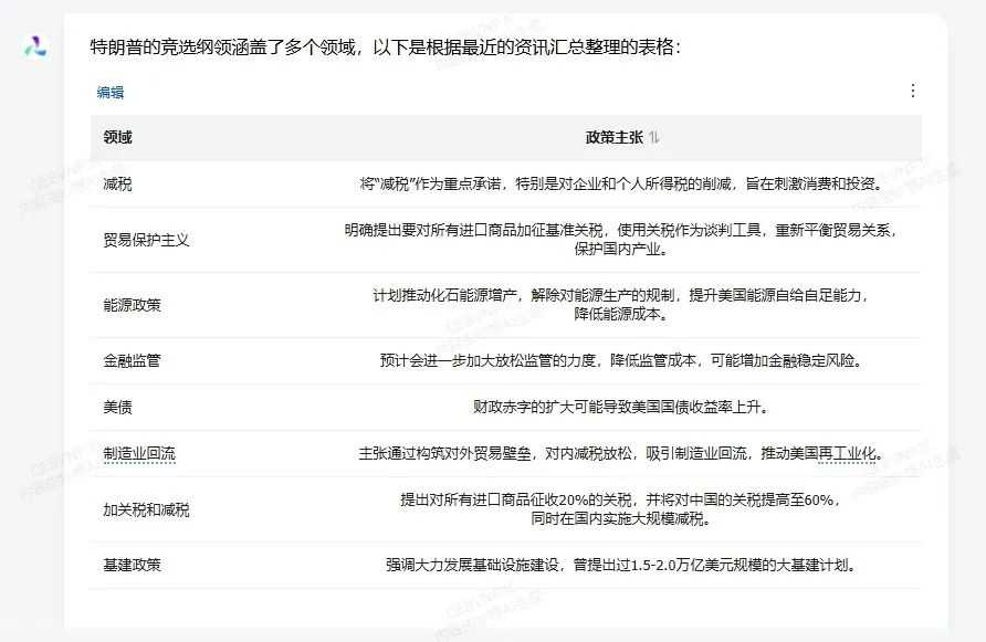 通过Choice智能金融终端的AI问答功能,可以更加全面地了解特朗普的政策主张,进而挖掘更多的“特朗普交易”机会。