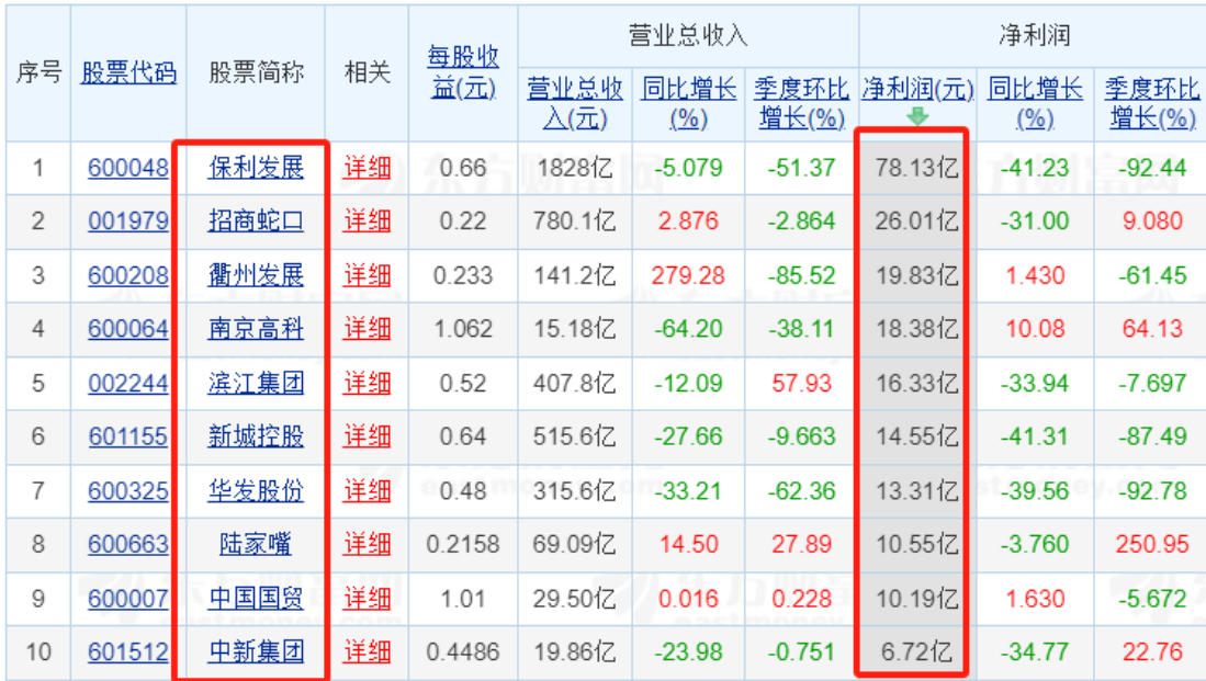 2024年前三季度A股归母净利润前十房企(截至10月30日20:40)来源:东方财富