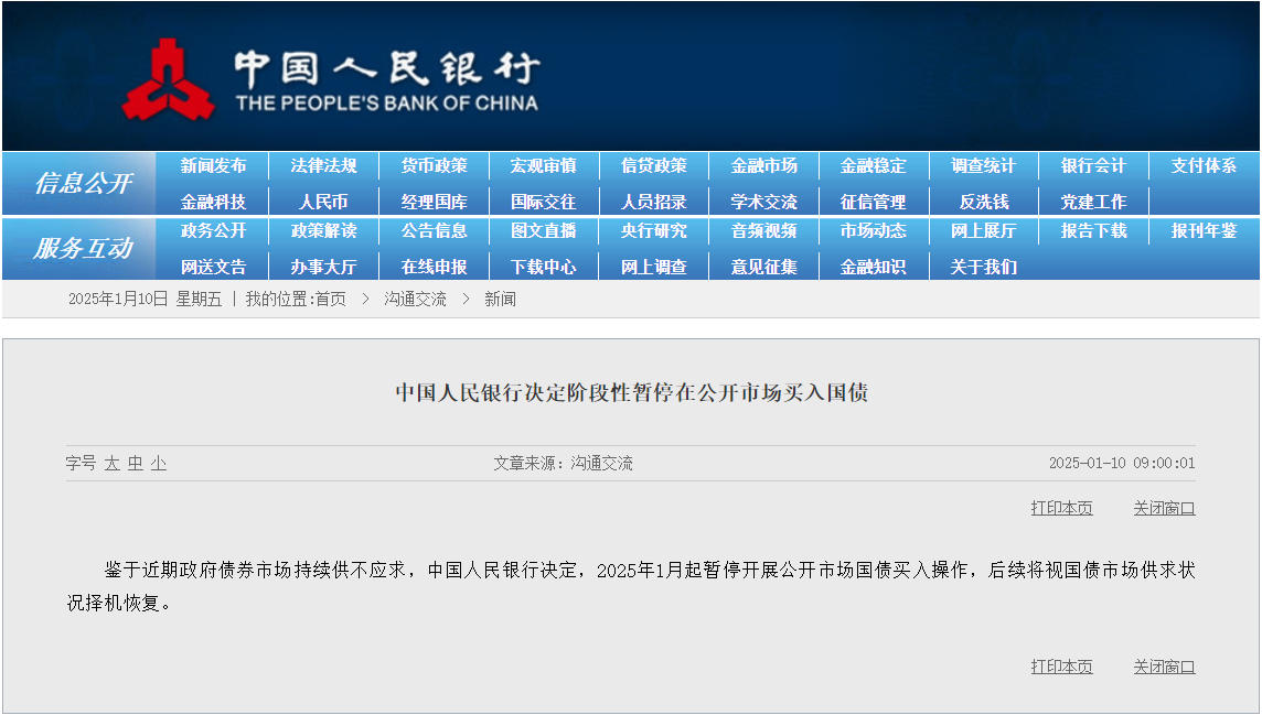 财联社1月10日最新报道,针对近期政府债券市场需求旺盛,供应量难以满足市场需求的现状,中国人民银行已正式作出决策。自2025年1月起,央行将暂停在公开市场上进行国债的买入操作。这一举措旨在平衡国债市场的供需关系,确保市场的平稳运行。未来,央行将根据国债市场的供求状况,选择合适的时机恢复公开市场国债买入操作。