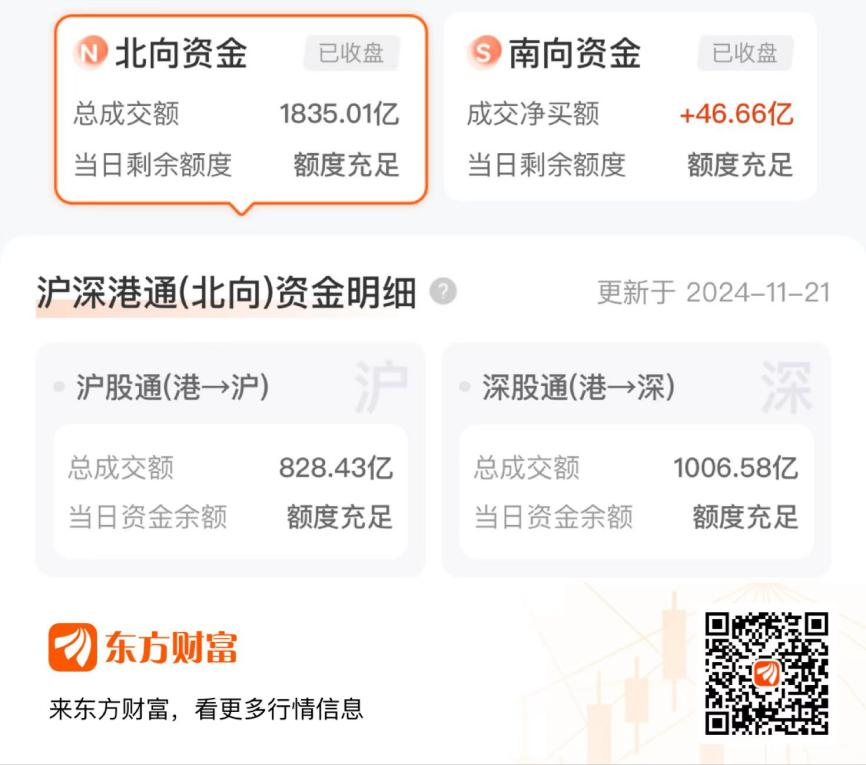11月21日,A股市场震荡分化,北向资金成交额达1835.01亿元。沪股通前三为中信证券、长江电力、赛力斯;深股通前三为东方财富、宁德时代、中际旭创。陆股通龙虎榜显示,9股获净买入,12股遭净卖出。