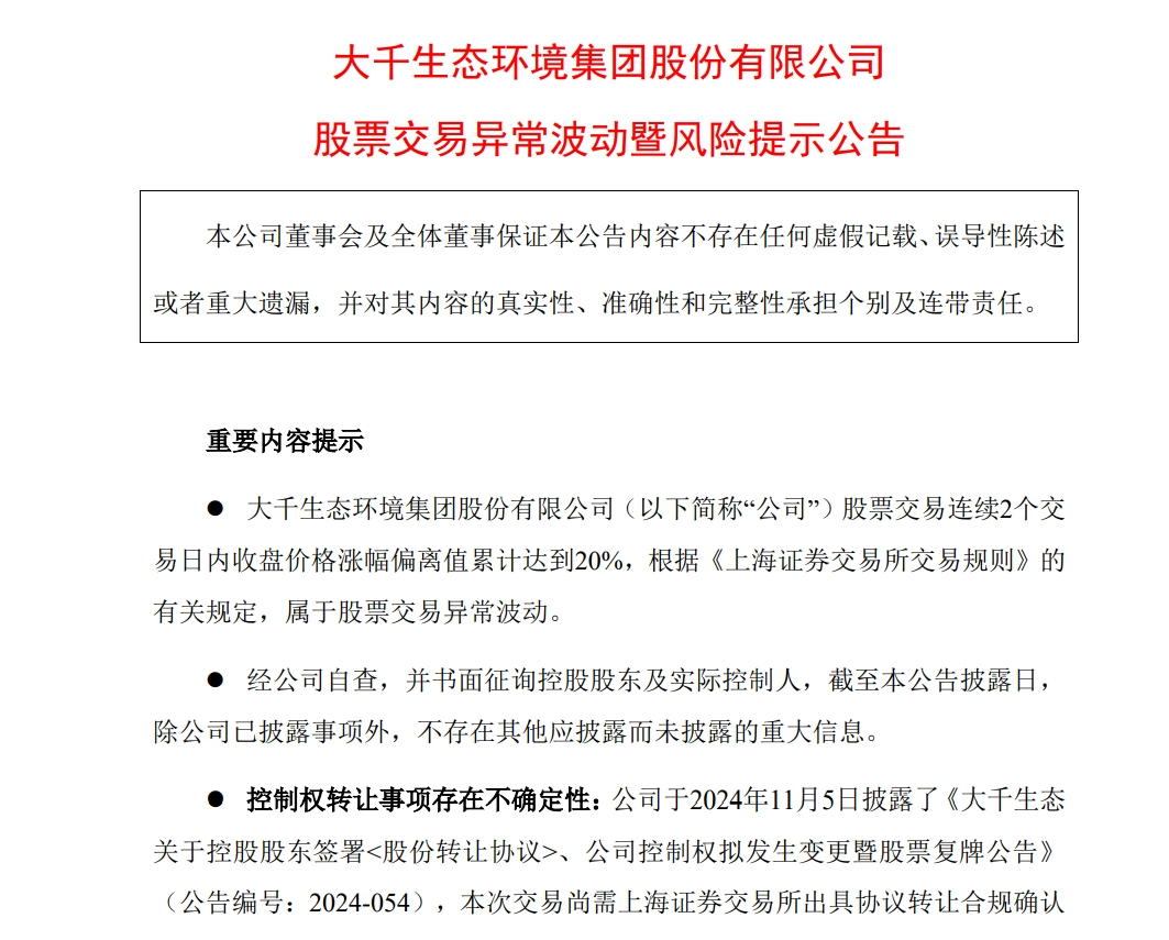 大千生态股价异常波动,控制权拟变更,财务状况引关注