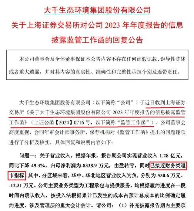 大千生态发布股价异常波动公告,指出市盈率市净率高于行业水平,股价涨幅大且换手率高。同时,公司控制权拟变更,财务状况接近退市指标,但公司生产经营正常,提醒投资者注意风险。