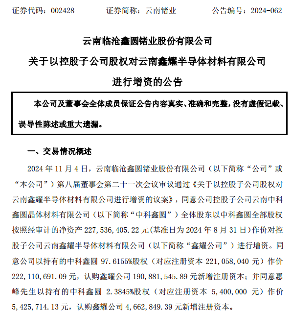 云南锗业11月5日晚间发布公告,宣布计划增资其子公司云南鑫耀半导体材料有限公司(鑫耀公司),同时透露鑫耀公司正计划通过增资扩股方式引入新投资者。