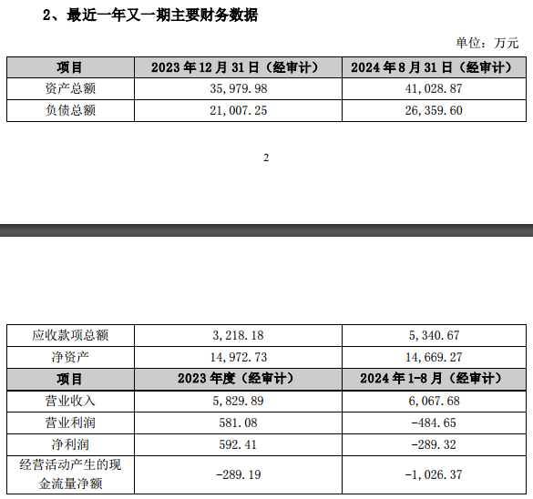 截至2024年8月底,鑫耀公司的总资产为4.10亿元,净资产为1.47亿元;2023年全年及2024年1至8月,公司净利润分别为592.41万元和-289.32万元。