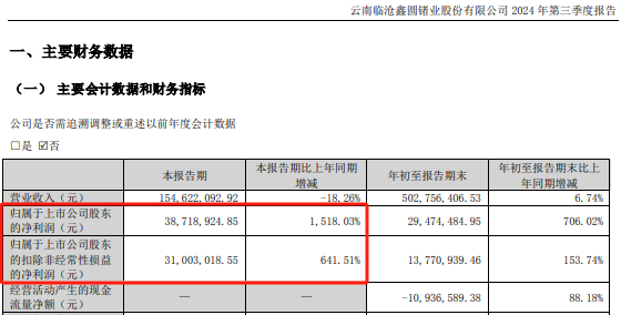 受上述因素影响,云南锗业2024年第三季度的净利润为3871.89万元,同比增长1518.03%;扣非后净利润为3100.30万元,同比增长641.51%。