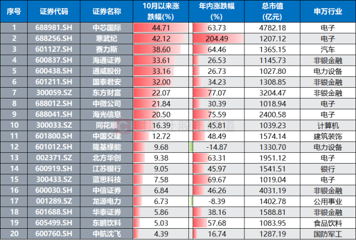 注:10月以来涨幅居前的千亿市值(9月末时总市值超1000亿元)股(截至11月4日收盘)