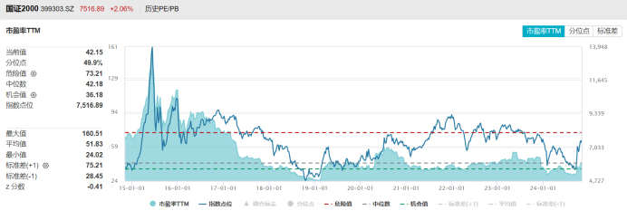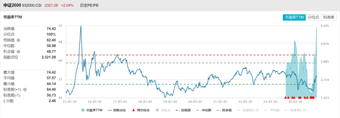 目前,大小盘风格分化持续。天风证券近日研报指出,大小盘指数表现的强弱取决于市场定价主体的变化,当前小盘及业绩亏损因子显著跑赢,背景是高风险偏好的活跃自然人资金占据主导地位。此外,从指数估值层面看,代表小微盘的国证2000、中证2000指数目前市盈率(TTM)分别为42.15倍、74.42倍,分别处于近十年49.9%百分位、历史100%百分位。