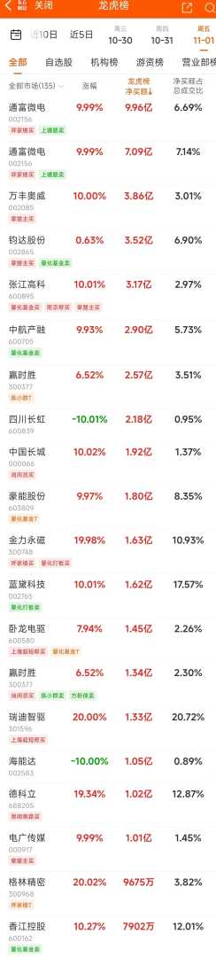 沪深港通十大成交股方面,贵州茅台、中信证券和赛力斯位列沪股通前三,而东方财富、宁德时代和TCL科技则位列深股通前三。龙虎榜数据显示,通富微电成为资金净流入最多的个股,金额为9.96亿元,当日涨停收盘。