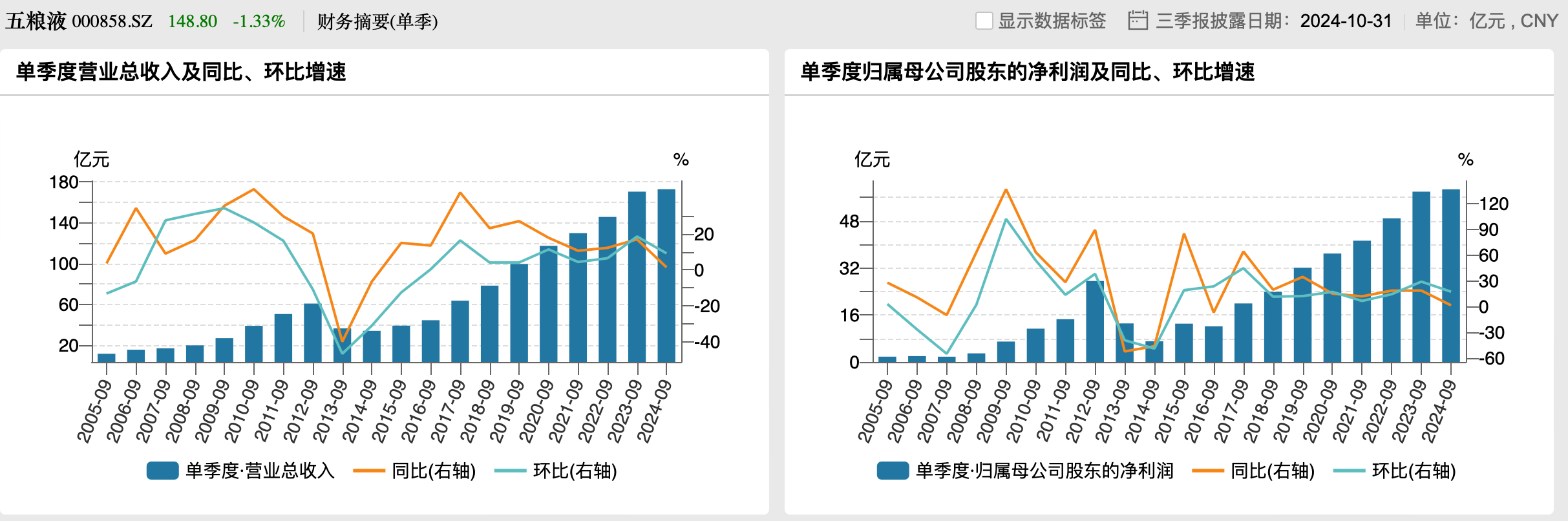 截至10月30日收盘,五粮液股价报148.8元/股,跌1.33%,但年初至今股价已上涨近一成。