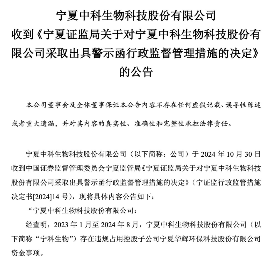 同日,*ST宁科还因多项违规行为被宁夏证监局下发警示函,包括违规占用控股子公司资金、重大关联交易披露不及时且不完整、未及时披露重大担保逾期情况、董事会审议信息披露不及时完整以及未及时补选独立董事等。宁夏证监局决定对宁科生物采取监管措施,并记入证券期货诚信档案。