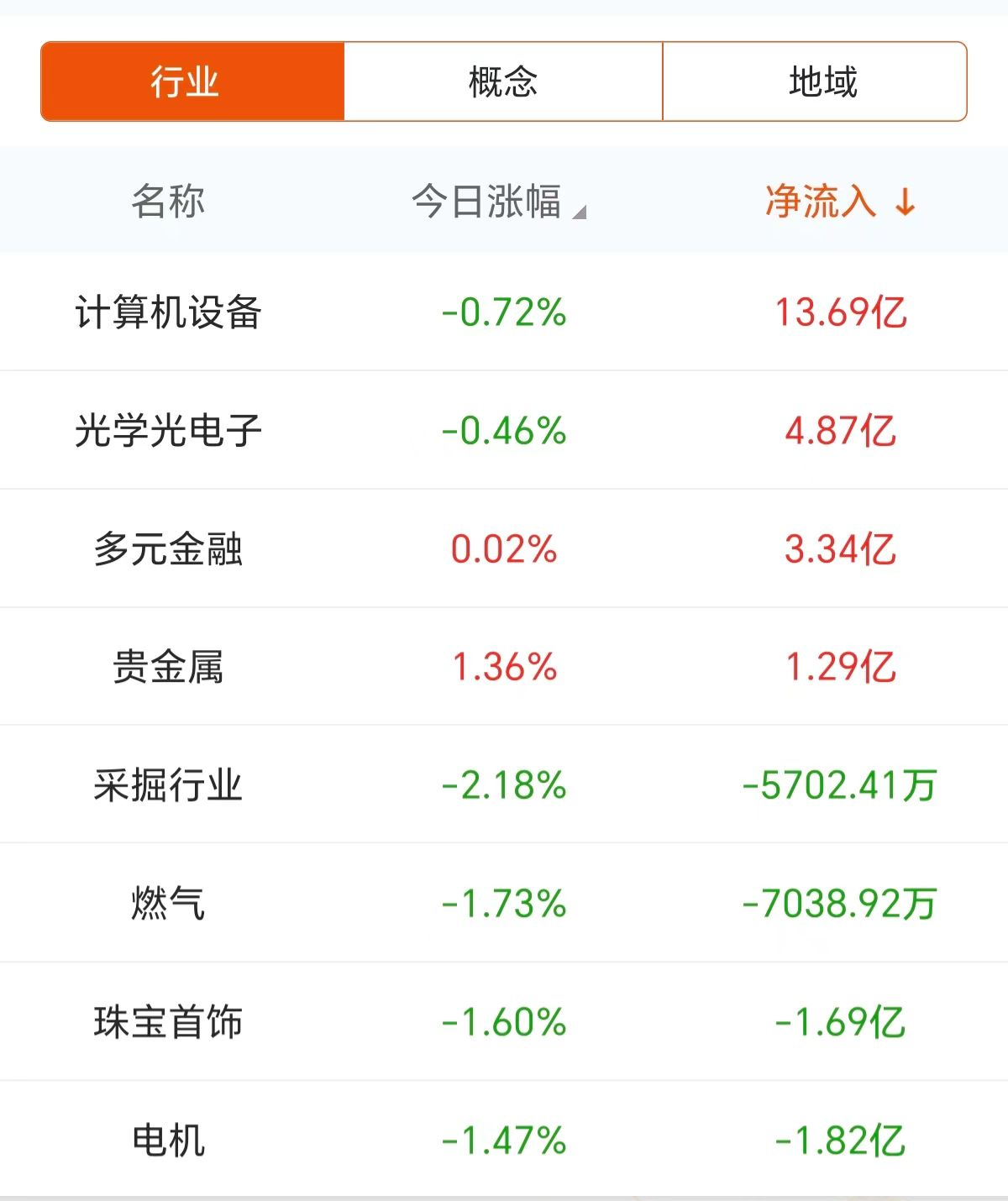 今日市场资金流向方面,计算机设备和光学光电子板块表现突出,资金净流入显著,其中计算机设备板块净流入资金高达13.69亿元。