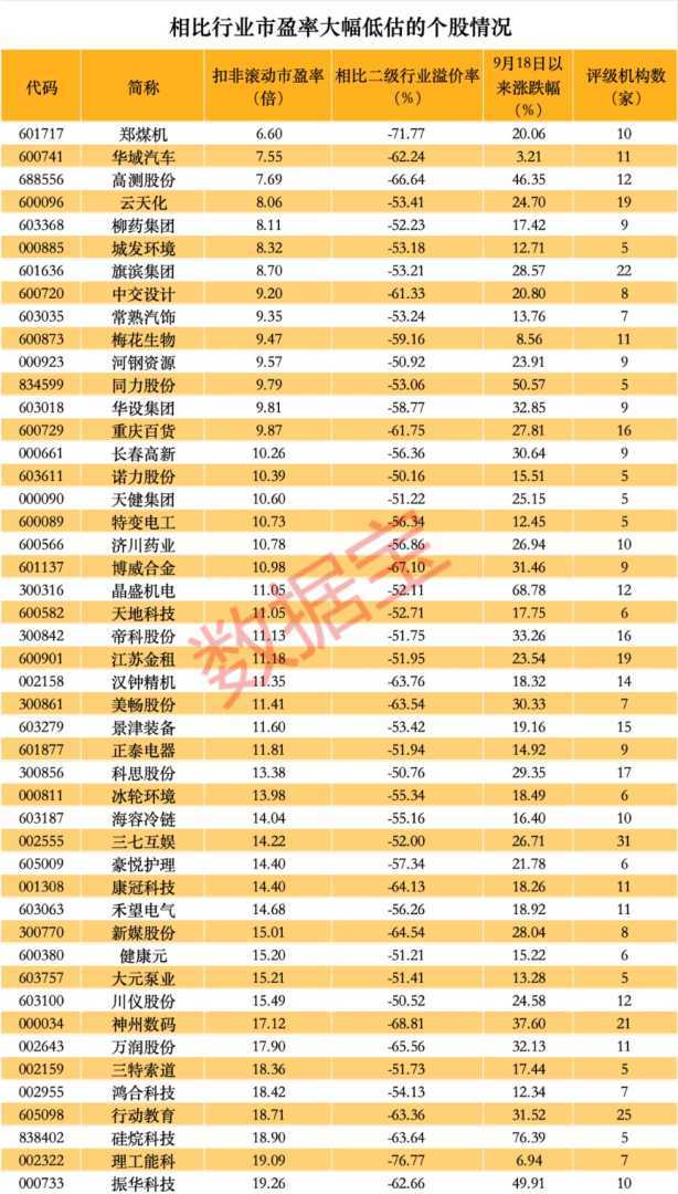 从最新市盈率角度看,有14只个股的扣非滚动市盈率低于10倍,其中郑煤机的市盈率最低,不足7倍;华域汽车、高测股份、云天化等个股的市盈率也均低于9倍。相对行业低估幅度最大的个股是理工能科,其最新市盈率为19.09倍,而行业市盈率超过82倍,低估幅度接近77%。其次是郑煤机,行业市盈率超23倍,低估近72%。此外,神州数码、博威合金、高测股份等10多只个股的低估幅度均超过60%。