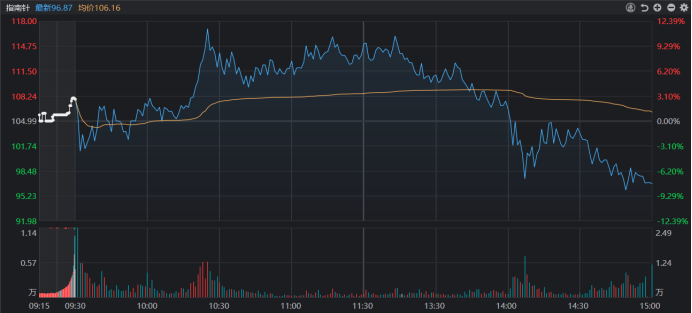 今日(10月23日),金融科技板块内多只个股经历“过山车”行情,其中金融科技龙头股指南针的表现尤为引人注目。该股票在早盘阶段创下历史新高,但午后却出现急剧下跌,投资者若在全天最高点买入,截至收盘将面临近18%的亏损。