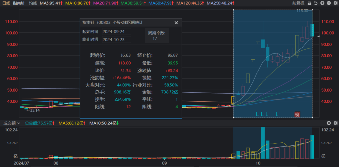 注:指南针9月24日以来震荡走高(截至10月23日收盘)