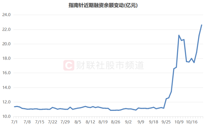 从资金面来看,指南针近期股价的持续攀升吸引了大量杠杆资金的涌入。截至10月22日,指南针的融资余额已达到22.61亿元,创上市以来的新高。与此轮上涨行情起始时(9月24日)相比,指南针在近16个交易日内的融资净买额高达11.5亿元,增幅接近102.9%,实现了翻倍式增长。特别是在10月9日和9月30日,其单日净买额均超过3亿元。