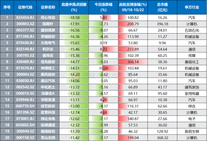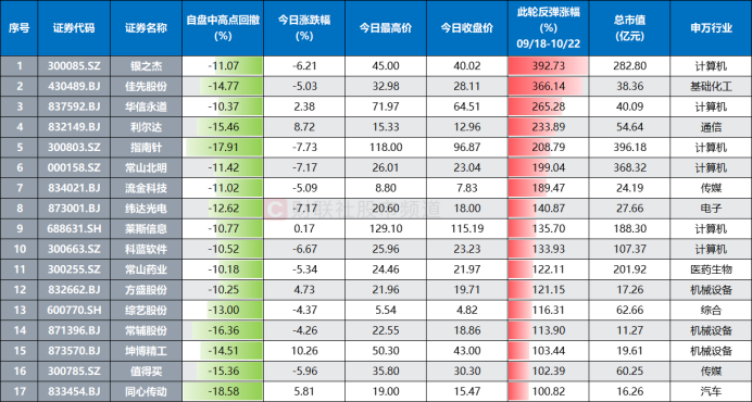 注:今日(10月23日)回撤超一成且此轮反弹(9月18日至10月22日)涨幅翻倍的个股
