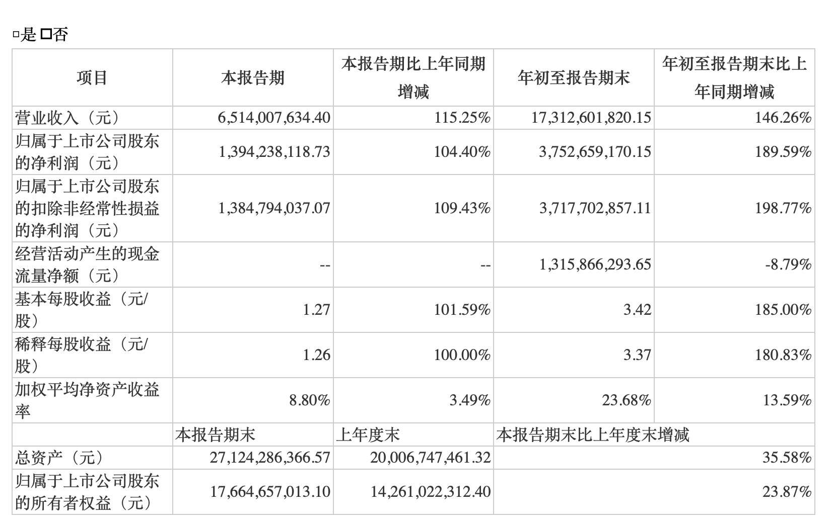 在AI技术的推动下,光模块需求激增,中际旭创股份有限公司(简称“中际旭创”,300308.SZ)第三季度业绩实现显著增长。10月22日晚间,中际旭创公布了其2024年第三季度财务报告,数据显示,公司在第三季度实现营业收入65.14亿元,较去年同期增长了115.25%;归属于上市公司股东的净利润更是达到了13.94亿元,同比增长104.4%。前三季度,公司总营业收入为173.13亿元,同比增长146.26%;净利润累计37.53亿元,同比增长高达189.59%。