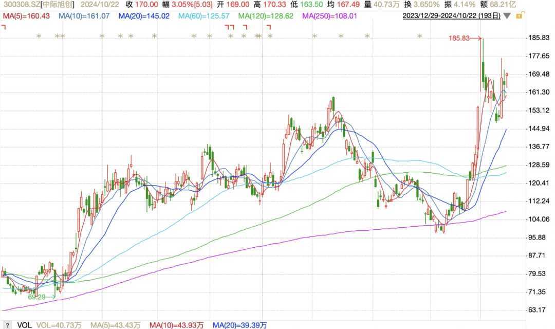今年以来,中际旭创股价表现强劲,累计上涨110.11%,并在10月8日盘中创下185.83元/股的历史新高。截至10月22日收盘,公司股价收涨3.05%,报170元/股。