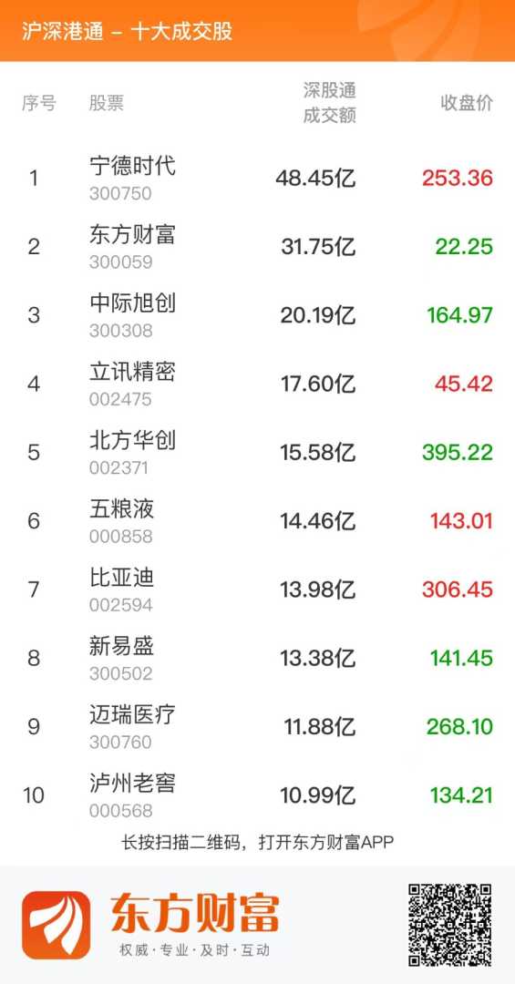 在沪深港通的交易中,陆股通十大成交股的数据揭示了市场的热点。具体来看,沪股通前三名分别为中信证券、贵州茅台和工业富联,它们的成交额分别达到23.08亿元、21.17亿元和18.95亿元。而在深股通方面,宁德时代、东方财富和中际旭创位居前三,成交额依次为48.45亿元、31.75亿元和20.19亿元,这些股票的活跃交易为市场增添了活力。